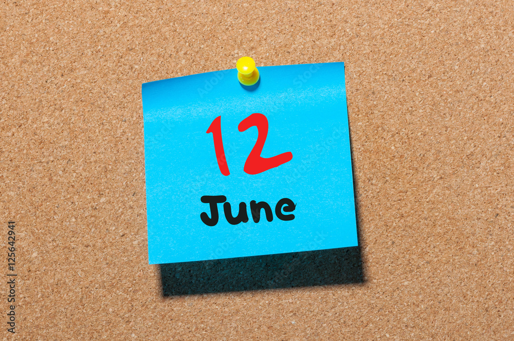 June 12th. Day 12 of month, color sticker calendar on notice board